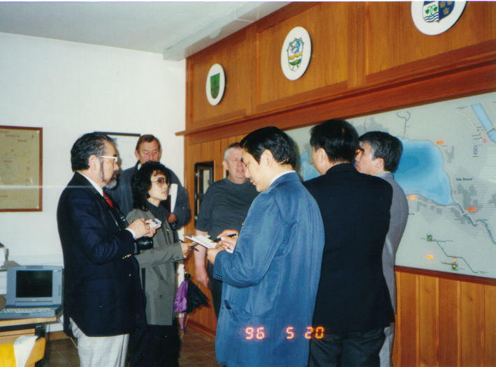 早い朝食を済ませ、ロビーでミーティング。疲れはない。今日からは行政機関訪問なので、全員がスーツにネクタイ。同宿している日本人観光客の女性たちが、「あら、お仕事だったんですか」と。 ミュンヘンの人は時間に正確である。遅れることは無論ないが、先に来て待っているということもない。我々は8時30分頃、市役所に到着した。約束の時間まで、30分程ある。早速、好奇心旺盛に庁舎の内外を見てまわる。仕事が始まる時間帯のせいもあり、皆忙しそうに歩いている。「勤勉なドイツ人」という表現が頭をよぎる。しかし庁舎は古い。極めつけはエレベーターだ。各階ホールの壁に長方形の穴が二つ並んで空いていて、その中を移動式の棚がゆっくりと動いていく。右の穴は下行き、左の穴は上行き。もちろんドアはない。ちょうど観覧車と立体駐車場を組み合わせたようなものである。職員は器用にそれに飛び乗る。ひとつの棚に2人づつ。日本人ならイライラするところだ。欧州の近代化が、歴史と伝統を大切にしながら進められてきた証の断片を見た思いがする。 活力と安らぎ―緑の街ミュンヘン 我々を迎えてくれたのは、今年3月までミュンヘン市都市計画局長だったゲルハート・マイヘーナーさん。現職中を含め、街づくりの講演で世界中を飛び回っている人だ。日本にも何度も来たという。役人という印象はなく、専門家という表現が当てはまる。それもそのはず、ミュンヘンでは都市計画にたずさわる市職員は、大学時代にそれを選考したことが採用条件であり、採用後は他の部局に移ることはないという。 スライドを使ったゲルハートさんのレクチャーと質疑など、およそ3時間に及ぶやりとりは、その後の我々の欧州視察の内容と方向を左右することとなる。 通訳(写真左)をはさんだやりとりであり、かつ、多岐にわたる内容を短時間に要約したやりとりであったことから、ゲルハートさんの意図を我々が十分に理解できたとは言い難い。我々なりに受け止めたことは、およそ次のとおりである。 まず第一に、ミュンヘン市の街づくりにあたっては、統一し、そして徹底した都市の設計思想が貫かれているということ。それは、前述したような担当部局職員のエキスパート化だけではなく、独立した建築家が街づくりに深く関与していることにも示されている。 第二に、そうした街づくりは、地方分権にもとづき、ミュンヘン市が独自の計画権を行使して進められてきたということ。 第三に、建造物の建設計画には、何重ものクリアーすべき段階が設けられているが、その中で二度にわたる市民参加が法的に保証されていること。 第四に、当初はいろいろな障害があったこと。特に、政治家と投資家(ゲルハートさんはそう表現していた)の癒着によりものごとが密室で決まり、都市計画(行政)にそれが押し付けられていた時代もあったこと。しかし現在では、市民監視の目が強まり、都市計画(行政)、市民、政治家、投資家、メディアの五者が、それぞれの機能と役割を果たしなから、街づくりが進められていること。 我々は、ゲルハートさんと話しているうちに、歴史と伝統と安らぎと活力が同居する、魅力あるミュンヘン市の秘密の一端に触れることが出来た喜びを覚え、再会を約束して、ミュンヘン市役所を後にした。 生き返った湖・テーゲルン湖 昼食後、できることなら、ゲルハートさんの話を実際に体験するため、2〜3日滞在したい気持ちを振り切り、我々はオーストリアとの国境近くにある、バイエルン州テーゲルン湖に向かった。 テーゲルン湖は、まわりを五つの町村に囲まれた湖であり、夏にはミュンヘンなどからも観光客が訪れ、水浴や日光浴を楽しむ観光地だ。 我々を乗せたワゴン車が湖岸に到着したころ、あいにくの雨が降り出した。雨の湖もなかなかいいものだと、しばらく車窓から眺めていたが、どこか日本の観光地にあるそれとは違う。まるで、人間の出入りがない山奥にある湖の趣なのである。しかし、よく見ると、ホテルや別荘などの建物もあるし、散策路になった湖岸にはベンチなども置いてある。問題は、それらの物がまるで自然と一体化しているかのように、違和感がないということだ。もちろん高層建物など無い。車道も水しぶきがかかるような位置につくられている日本のそれとは違い、高い樹木に隠れるようにつくられている。 このように自然と共にある観光地は、ヨーロッパでは簡単に探すことができるに違いない。我々がテーゲルン湖を視察先に選んだのは、他の理由があるからだ。実はここは、かつて、「死の湖」直前まで汚染が進み、富栄養化によるバクテリア汚染で水浴禁止が現実問題となった湖なのである。 それがどうして、極めて短期間に生き返ることができたのか。世界最初の湖水浄化作戦はどのように展開されたのか。我々は大きな興味を持ちつつ、汚水処理場を訪れた。 我々を迎えてくれたのは、処理場の責任者ブライラーさんと、技術